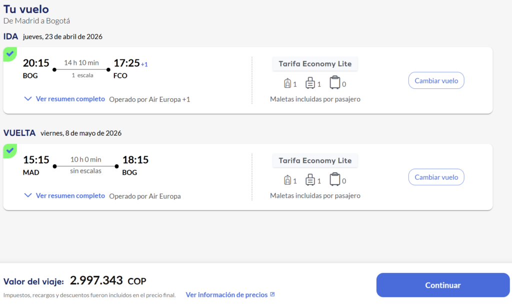 ✈️ Tiquetes de ida y regreso: $2.998.000 pesos / €700 / $829 usd